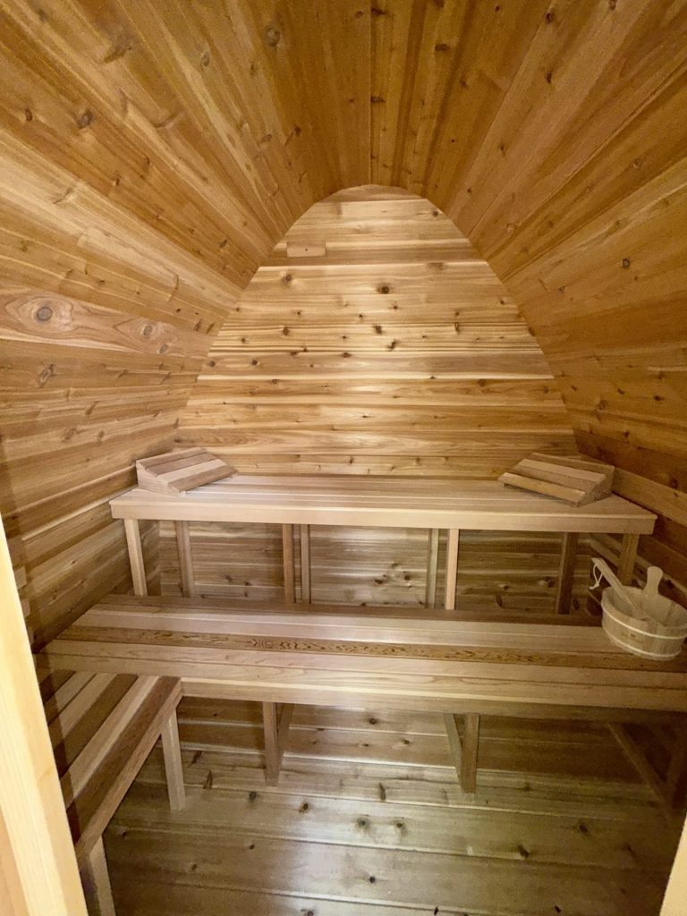 Our white cedar pod saunas are the ultimate place to relax on a cold or rainy day. Only available in select domes!
